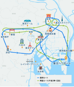 東京の主要スポットを30分で巡る充実のコース。レインボーブリッジ、お台場、東京タワー、スカイツリー、銀座、東京駅など、東京の魅力を余すことなく堪能できます。